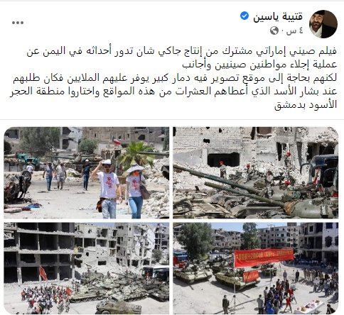 بدوره كتب الصحفي قتيبة ياسين على صفحته في الفيس أن شركة الإنتاج الصينية الإمارتية كانت بحاجة إلى موقع تصوير فيه دمار كبير يوفر عليهم الملايين، فكان طلبهم عند النظام السوري الذي أعطاهم العشرات من هذه المواقع واختاروا منطقة الحجر الأسود بدمشق.