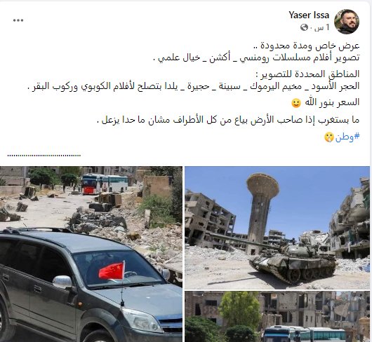 من جانبه كتب الناشط الفلسطيني ابن مخيم اليرموك ياسر عيسى على صفحته في الفيس بوك، وبلهجة تهكمية ساخرة: ” عرض خاص ومدة محدودة.. تصوير أفلام مسلسلات رومنسي _ أكشن _ خيال علمي”، مضيفاً أن المناطق المحددة للتصوير: الحجر الأسود _ مخيم اليرموك _ سبينة _ حجيرة _ يلدا تصلح لأفلام الكوبوي وركوب البقر، السعر بنور الله”.