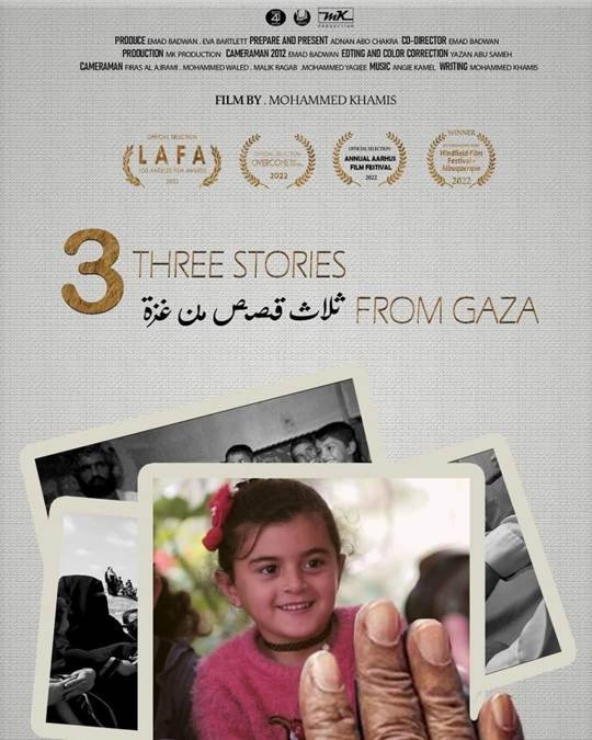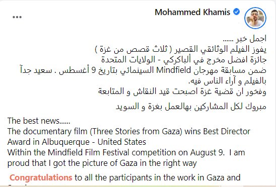نال المخرج الفلسطيني السوري محمد خميس جائزة أفضل مخرج ضمن مسابقة مهرجان (مندفيلد Mindfield) السينمائي الذي نظم في ولاية نيومكسيكة الأمريكية في التاسع من أغسطس/ آب 2022، وذلك عن فيلمه الوثائقي القصير الذي أنتجه بعنوان “ثلاث قصص من غزة”.